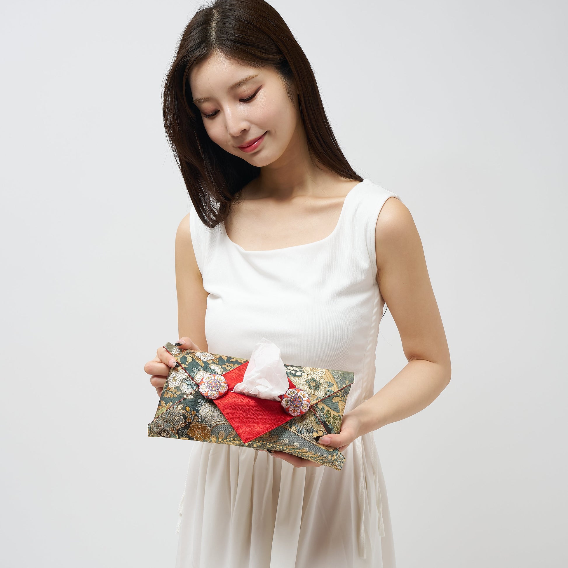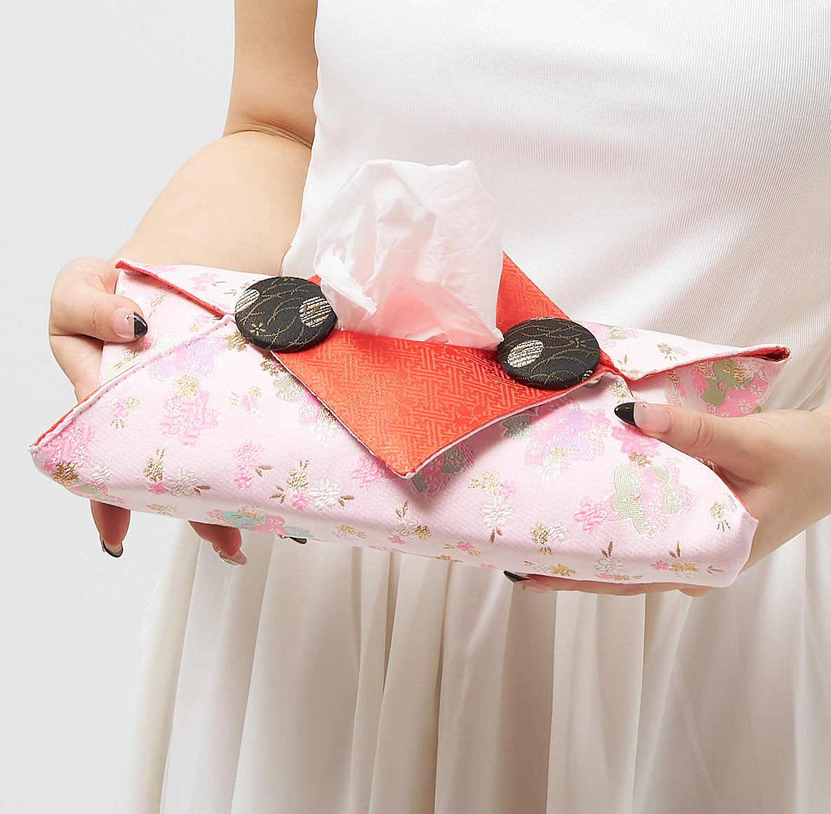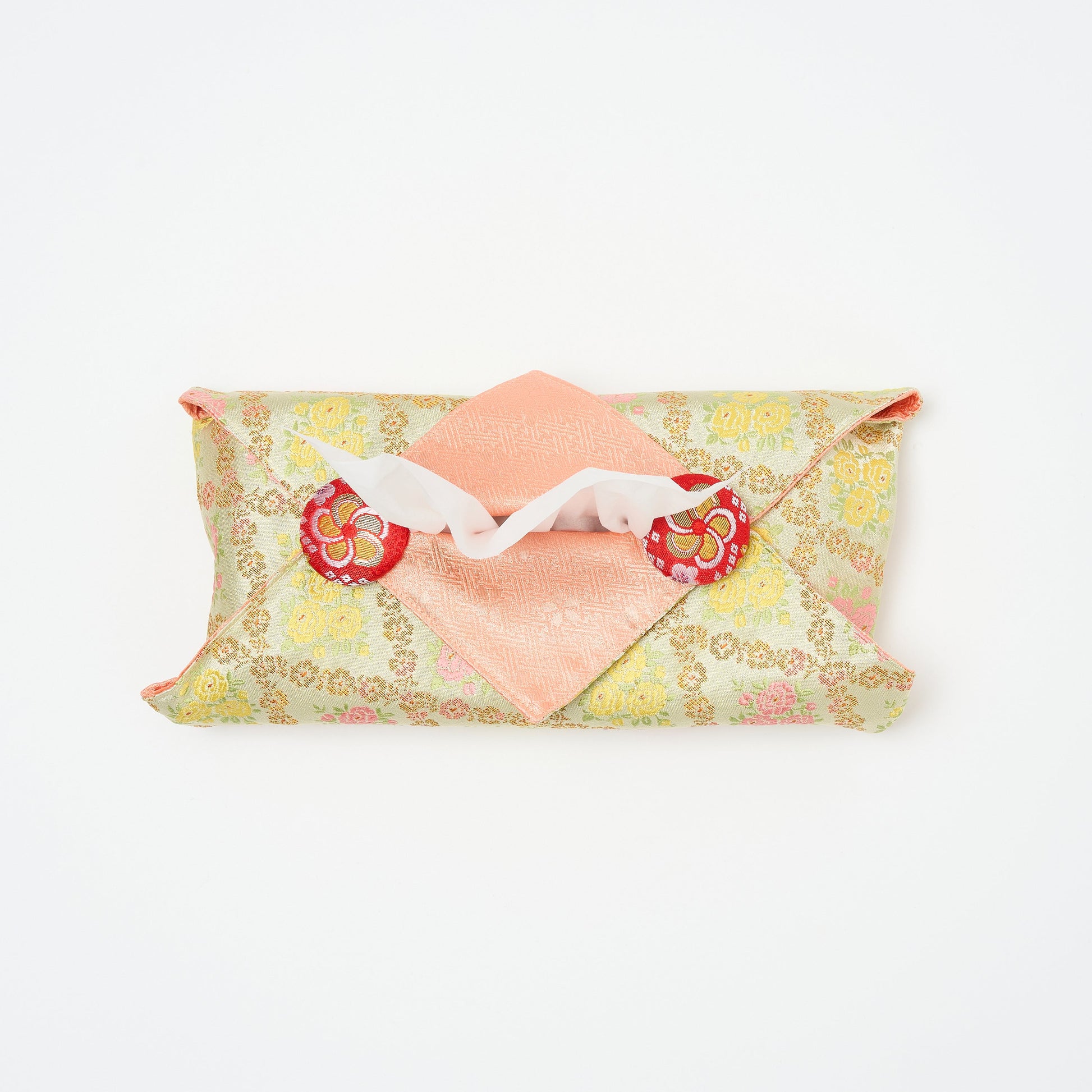 金襴のティッシュカバーは、ちょっと生活感が出やすい箱ティッシュをそっと優しく包んでくれます。 デスクや玄関に置いてあり、伝統の金襴生地の布が日常空間を良く彩ってくれます。