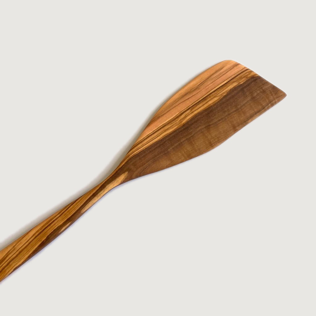シンプルなデザインと持ち手や厚みの使い勝手にこだわった一品。頑丈なオリーブウッドだからこそ実現できる薄さとシャープさです。大きめのフライパンでざっくり炒めるときにおすすめ。