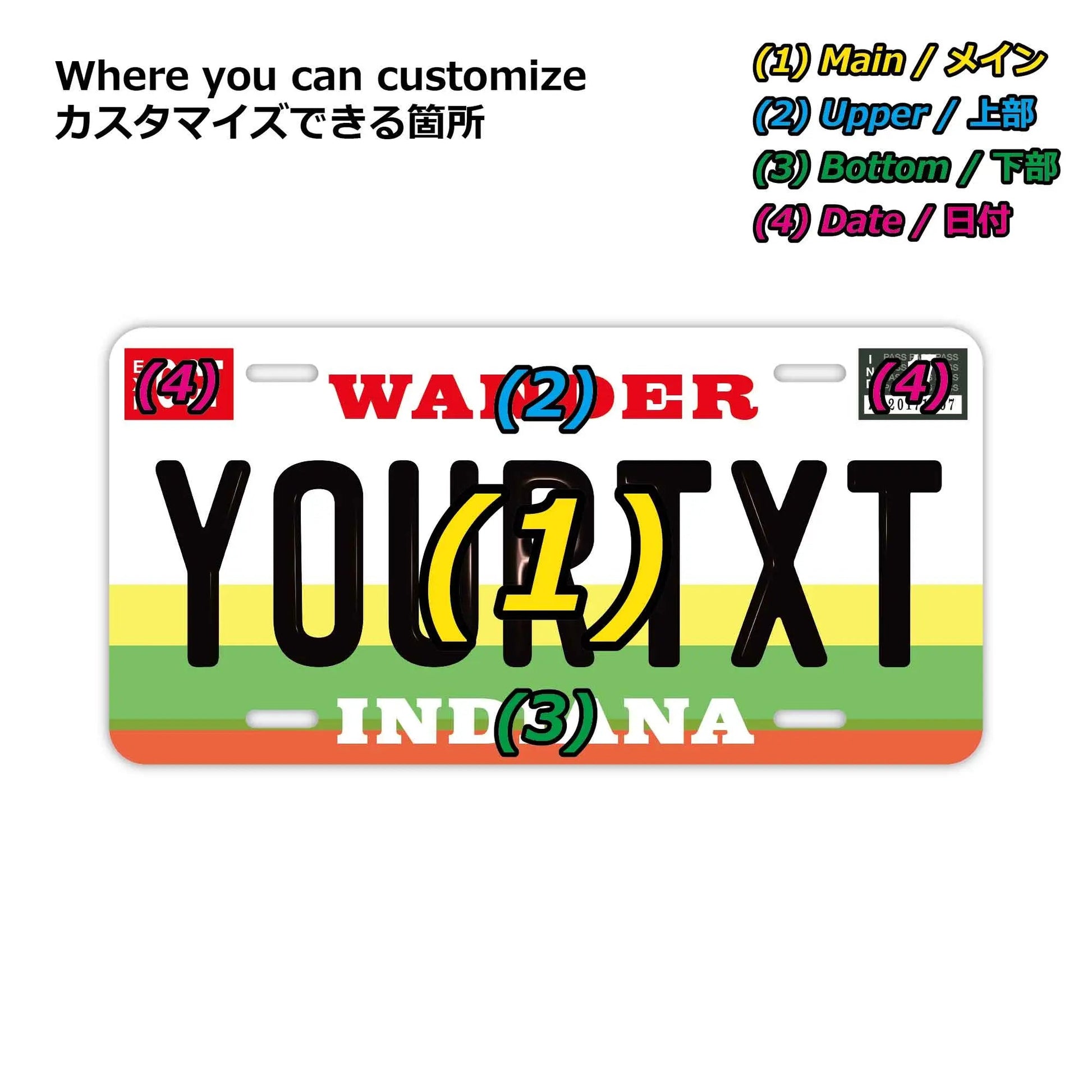 (1)メイン文字にご利用できるフォントは、アメリカライセンスプレートに利用されているものと類似のフォントを使っています。