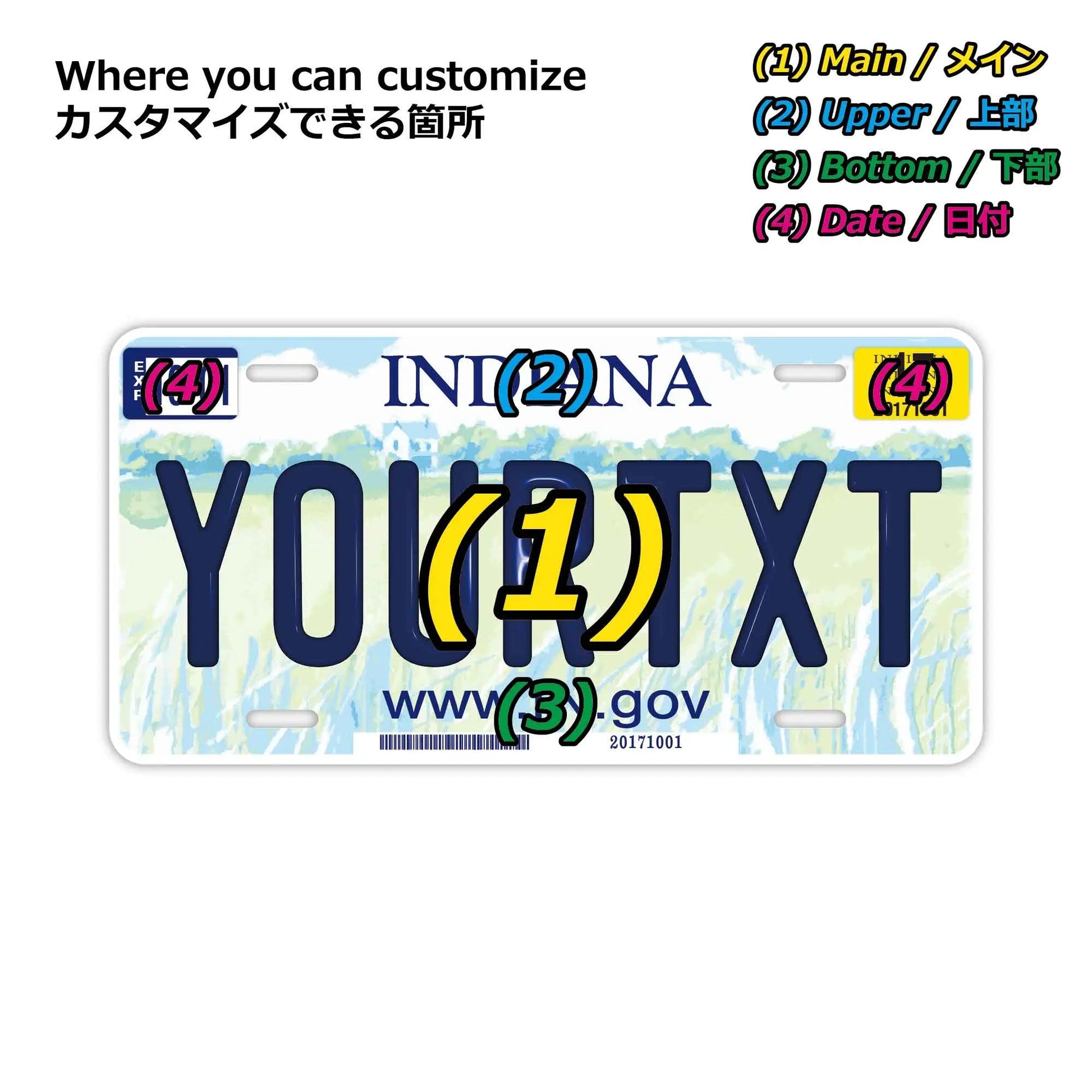 (1)メイン文字にご利用できるフォントは、アメリカライセンスプレートに利用されているものと類似のフォントを使っています。