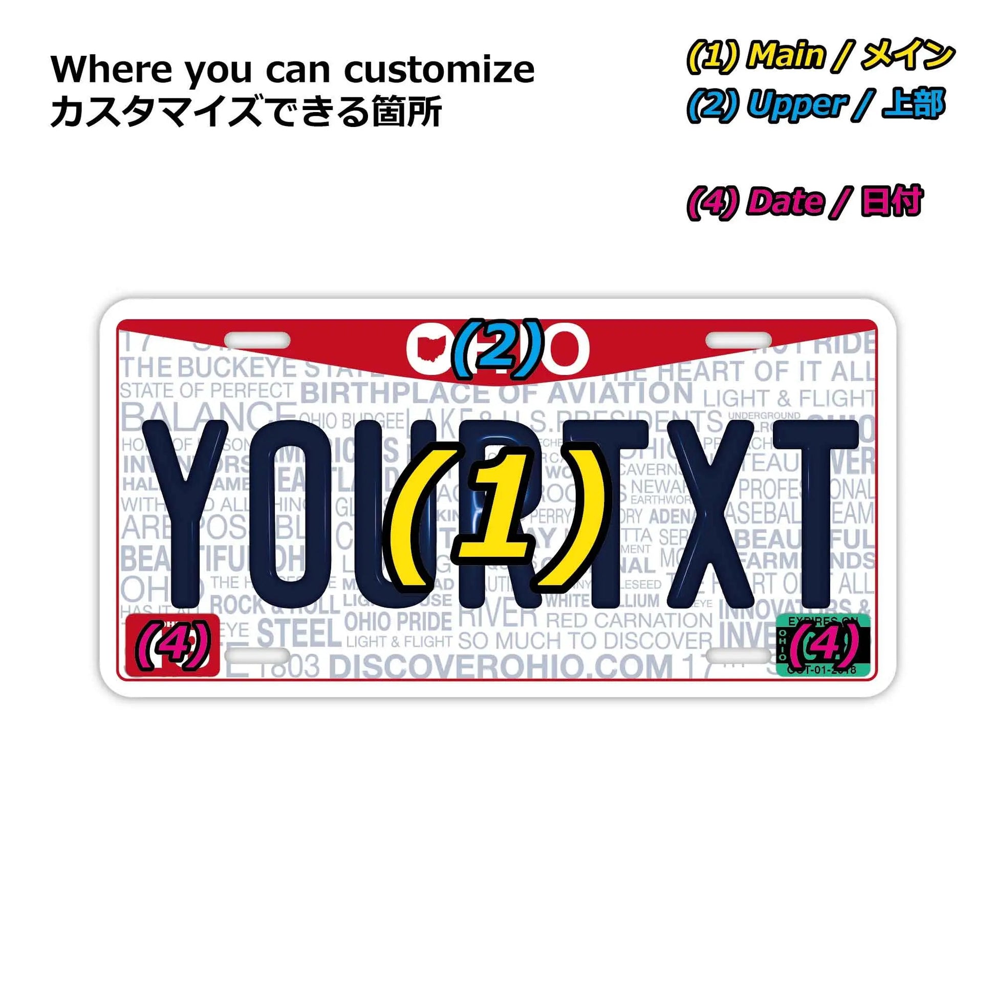 (1)メイン文字にご利用できるフォントは、アメリカライセンスプレートに利用されているものと類似のフォントを使っています。