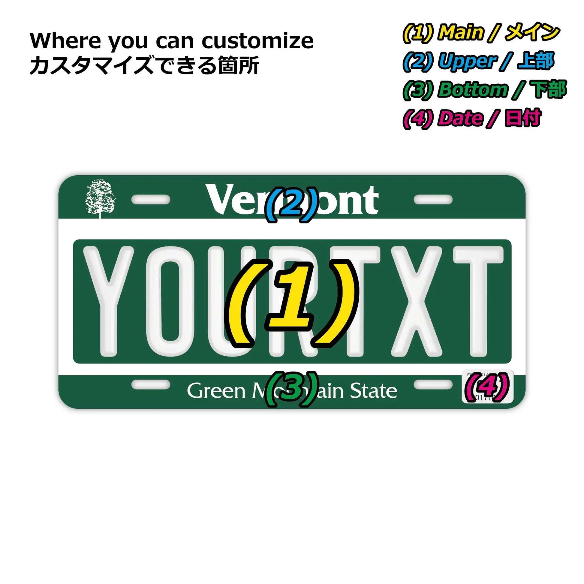 (1)メイン文字にご利用できるフォントは、アメリカライセンスプレートに利用されているものと類似のフォントを使っています。