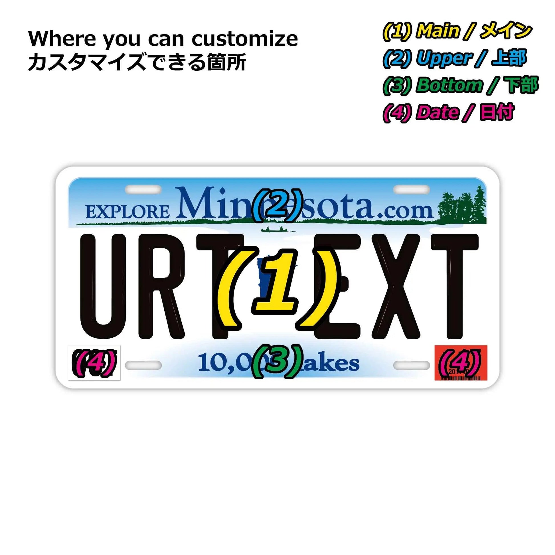(1)メイン文字にご利用できるフォントは、アメリカライセンスプレートに利用されているものと類似のフォントを使っています。