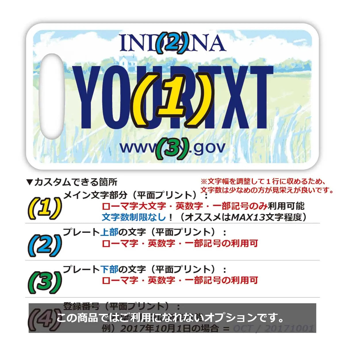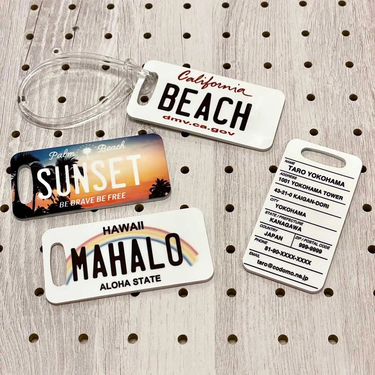 もちろん、オモテとウラ両面のカスタマイズが可能。デザインはアメリカのナンバープレートをモチーフとし、所有者の名前、住所、国名、電話番号、メールアドレス等を表記でき、紛失防止タグとしてしっかりお役に立てます!