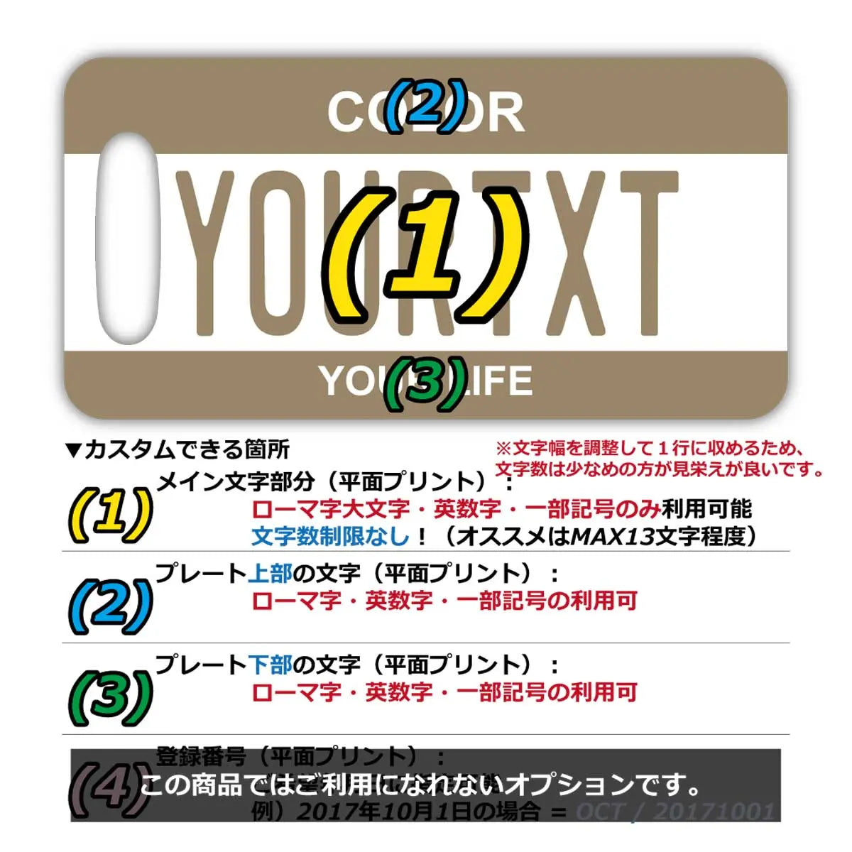 もちろん、オモテとウラ両面のカスタマイズが可能。デザインはアメリカのナンバープレートをモチーフとし、所有者の名前、住所、国名、電話番号、メールアドレス等を表記でき、紛失防止タグとしてしっかりお役に立てます!