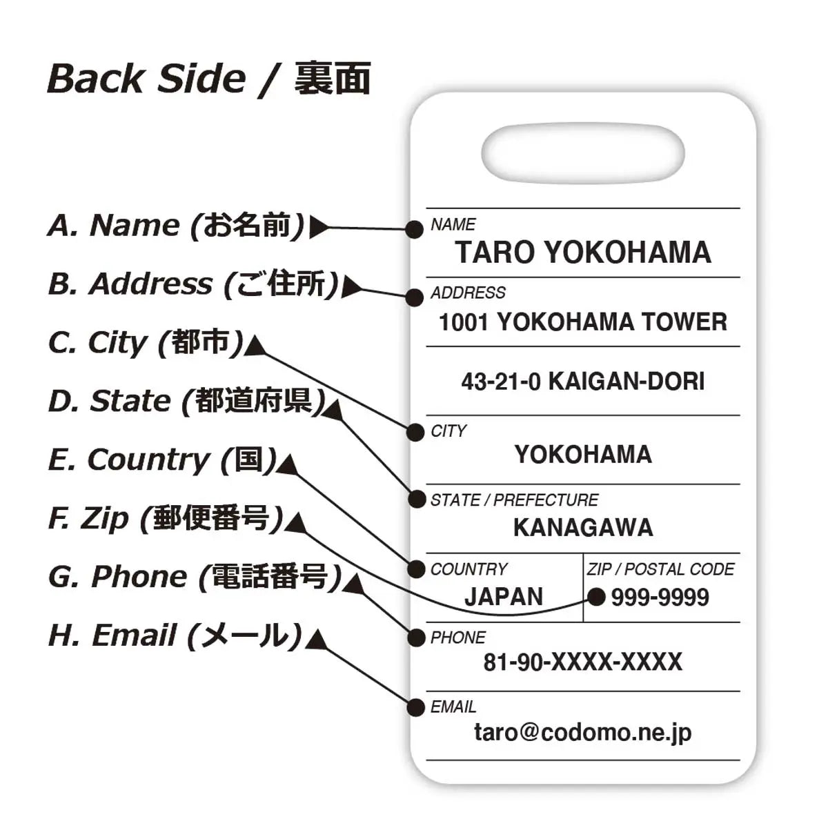 もちろん、オモテとウラ両面のカスタマイズが可能。デザインはアメリカのナンバープレートをモチーフとし、所有者の名前、住所、国名、電話番号、メールアドレス等を表記でき、紛失防止タグとしてしっかりお役に立てます!