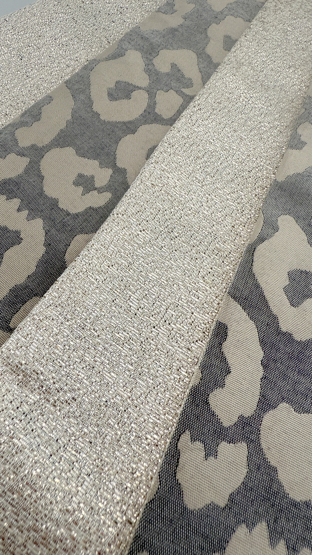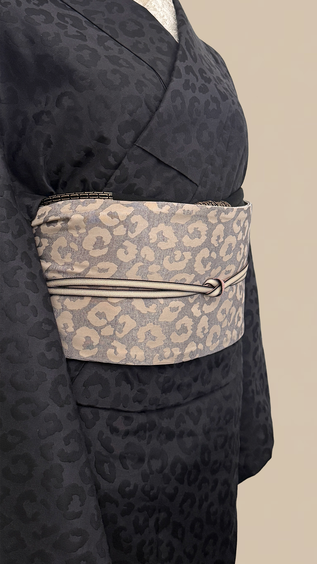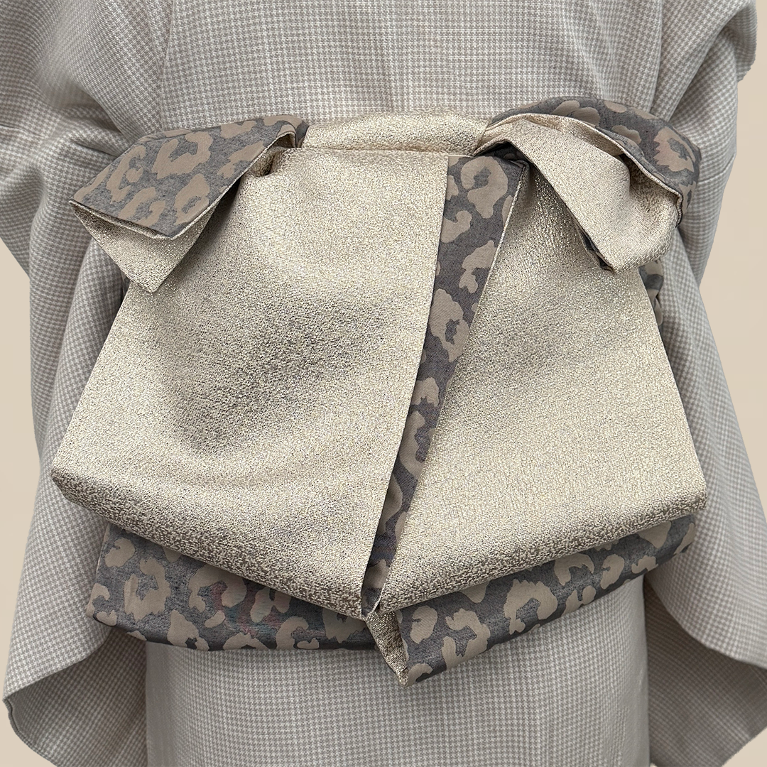 グレージュのヒョウ柄と砂色のグリッター(ラメ)、2つの顔を持つリバーシブル仕様の「大人の兵児帯」です。