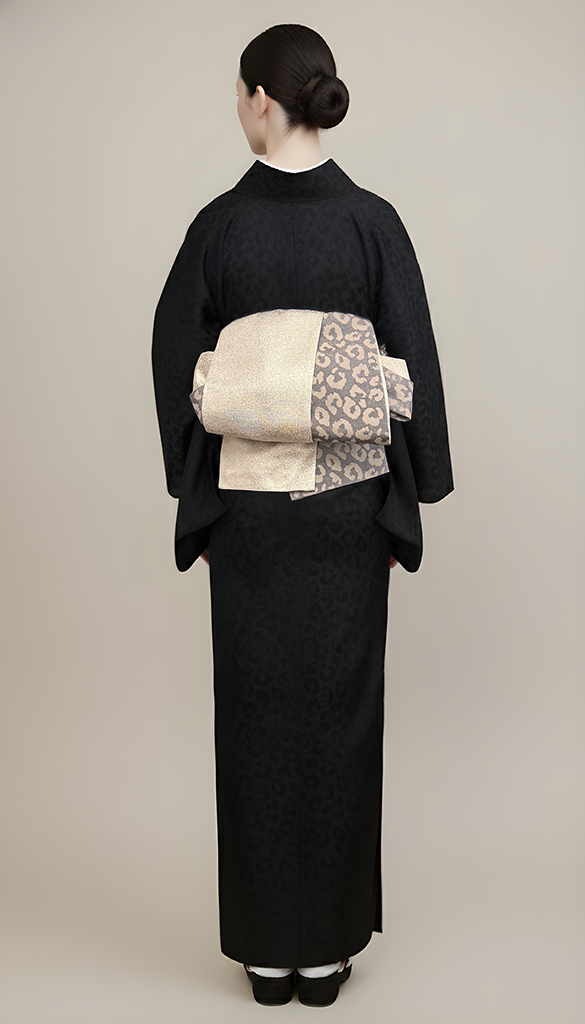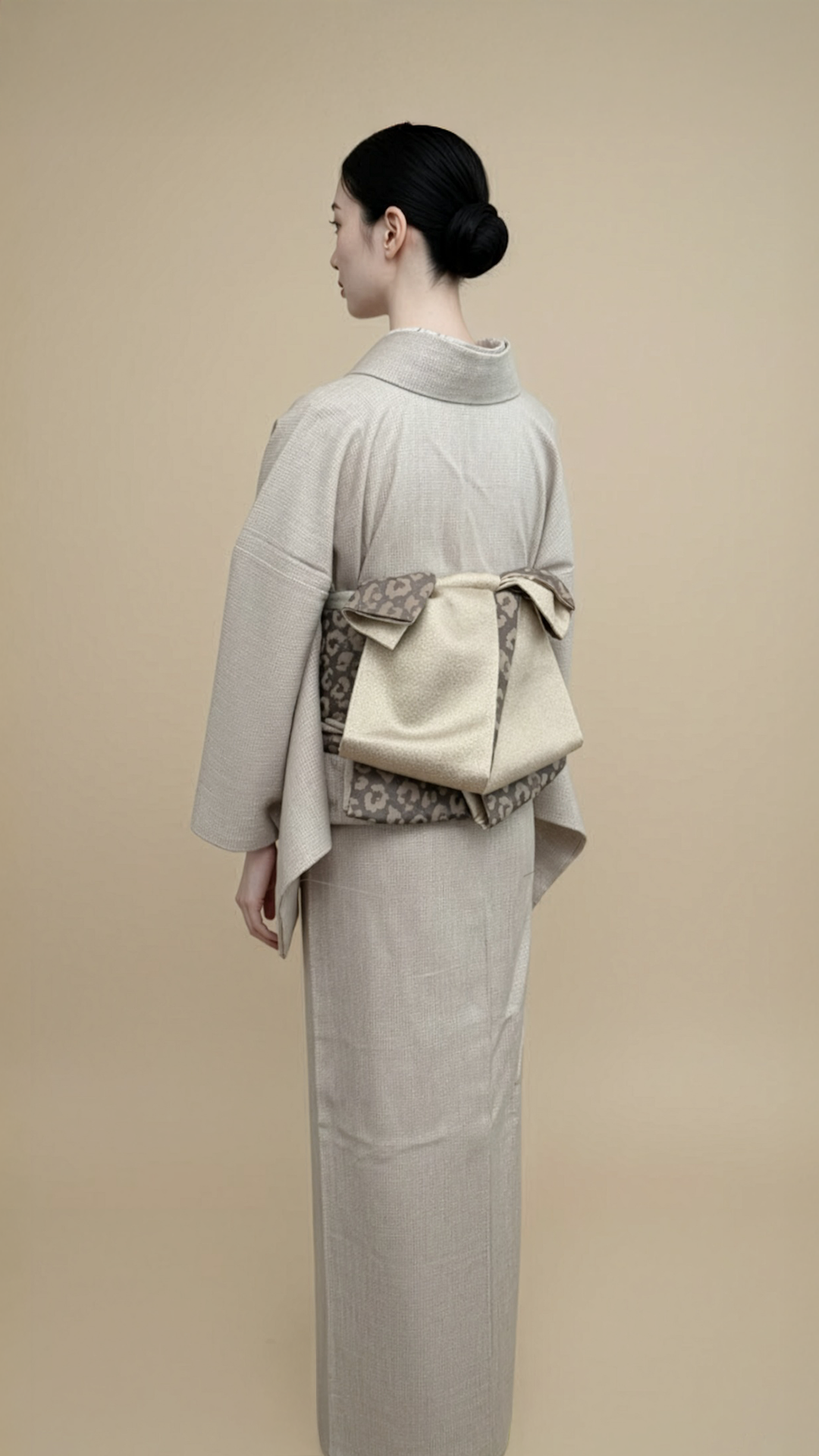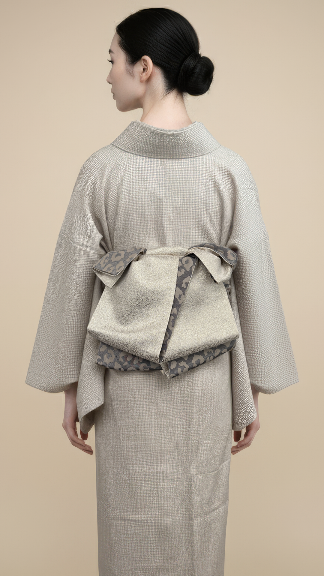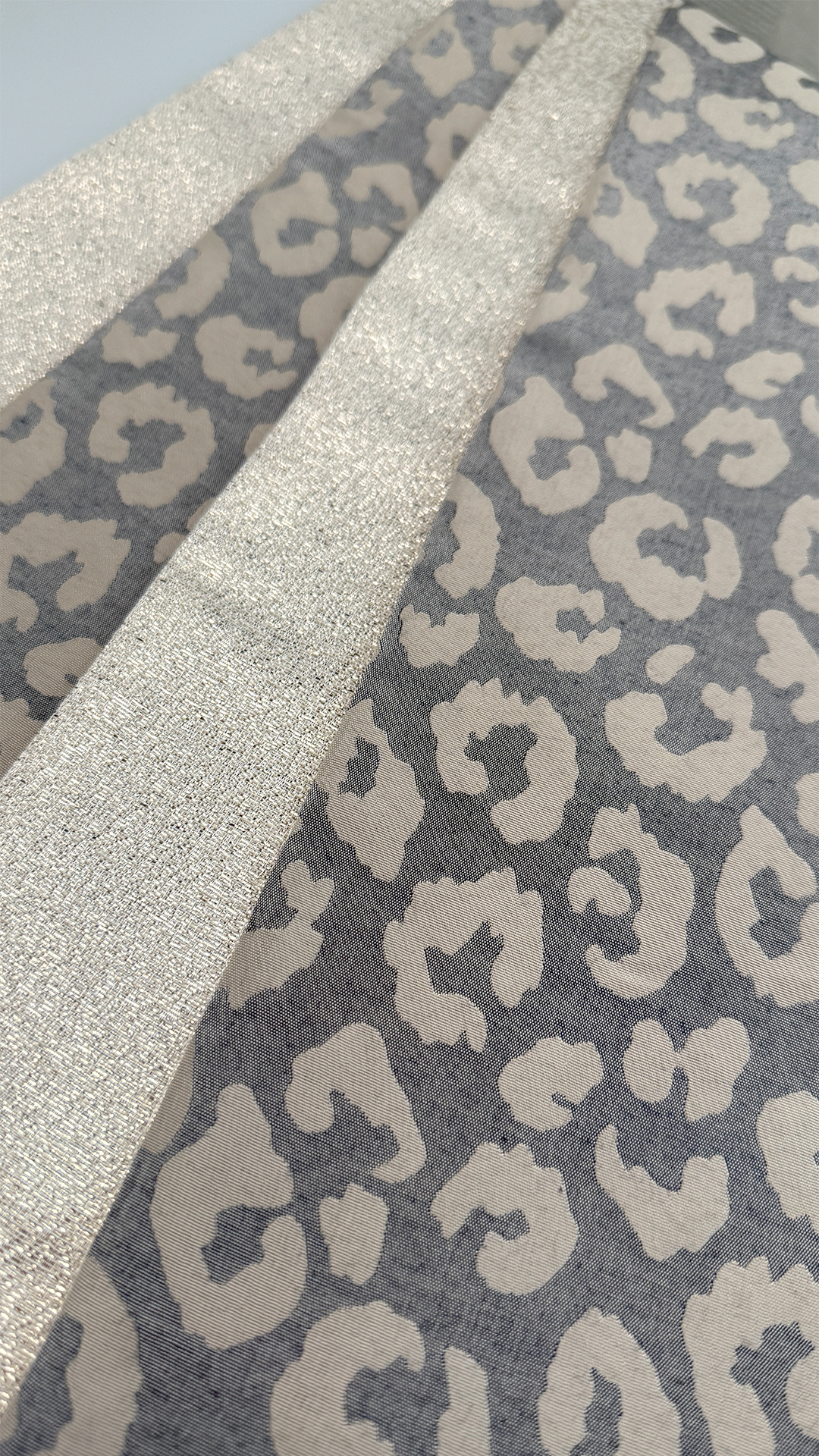 グレージュのヒョウ柄と砂色のグリッター(ラメ)、2つの顔を持つリバーシブル仕様の「大人の兵児帯」です。