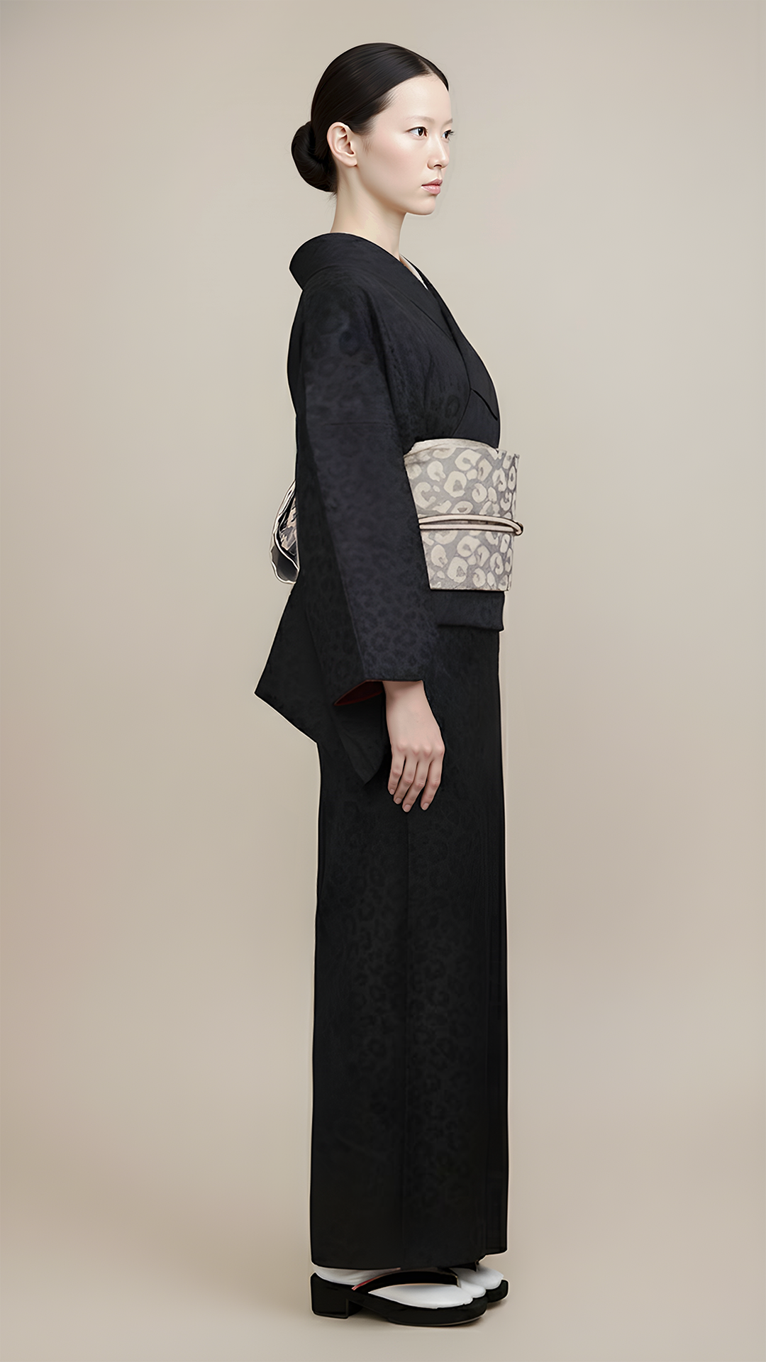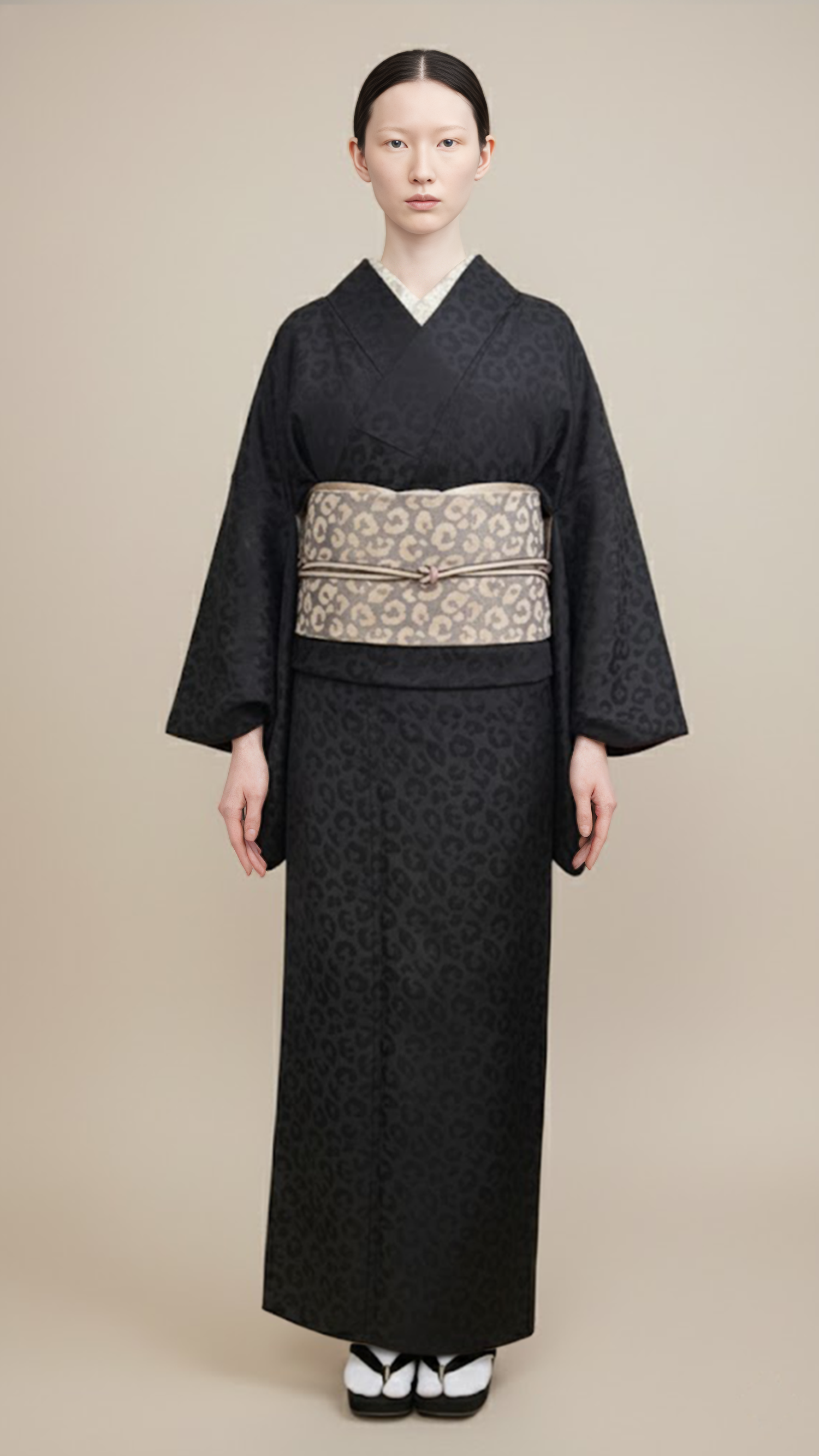 片面は、広大な砂丘を思わせる、絶妙なグレージュ(砂色)の地に浮かぶ同色のヒョウ柄。