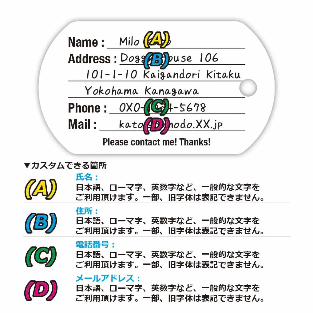 ご希望文字で1枚から生産できる、世界に1枚のドッグタグ!アメリカ製素材を使い日本国内でプリント。1枚1枚を手作りしています。水に濡れても錆びないアルミニウム素材。同じくアメリカ製のボールチェーンや、サイレンサー(フチのゴム)も選べます!