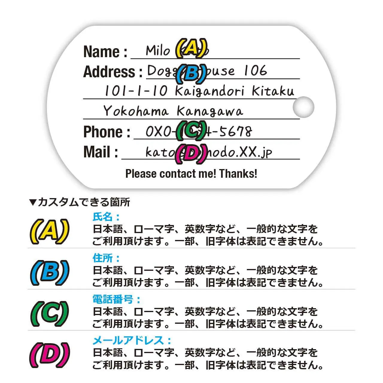 ご希望文字で1枚から生産できる、世界に1枚のドッグタグ!アメリカ製素材を使い日本国内でプリント。1枚1枚を手作りしています。水に濡れても錆びないアルミニウム素材。同じくアメリカ製のボールチェーンや、サイレンサー(フチのゴム)も選べます!
